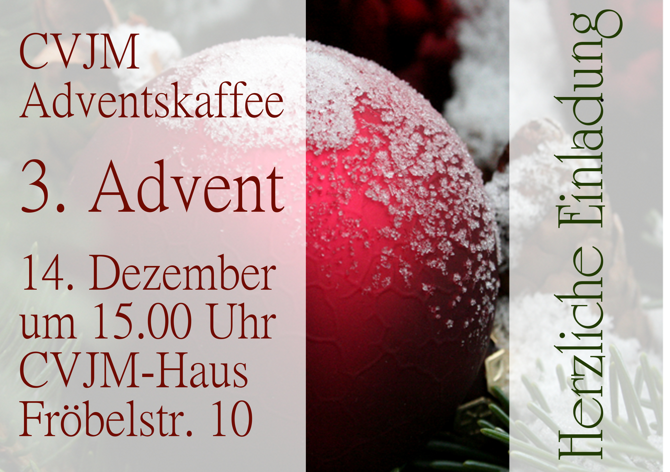 Herzliche Einladung zum CVJM Sonntagskaffee im CVJM Haus. Es gibt selbst gebackene Kuchen, interessante Gespräche und eine gute Gemeinschaft.